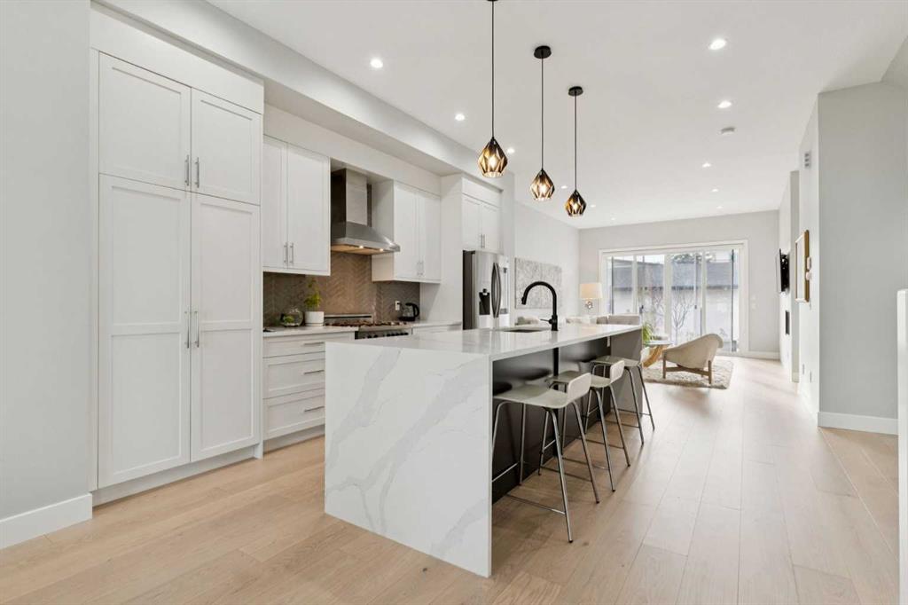 This sophisticated, contemporary semi-detached infill in Capitol Hill offers exceptional value with over 2,700 square feet of functional living space featuring 4 bedrooms, 3 and half bathrooms, premium finishes, and a south facing yard. The main floor boasts brand new engineered wide plank oak hardwood flooring, ten-foot ceilings, and generously proportioned living areas. These include a formal dining room, a living room with a sliding glass door to the rear yard, and a modern kitchen equipped with stainless steel appliances and shaker-style cabinetry. A tiled mudroom provides direct access to the double detached garage and includes built-in millwork for organized storage. A privately situated powder room completes this wonderful main floor. The upper level comprises three spacious bedrooms, two full bathrooms, and convenient second-floor laundry. The master suite features a sizable walk-in closet and a private five-piece ensuite with a freestanding soaker tub, a separate water closet, and an oversized glass shower. The fully finished basement includes a large recreation room with a wet bar, a fourth bedroom, and a fourth bathroom. Finally, the home is complete with air conditioning, charming landscaping, a very useful at-grade concrete patio, and irrigation. Book your private tour today.
